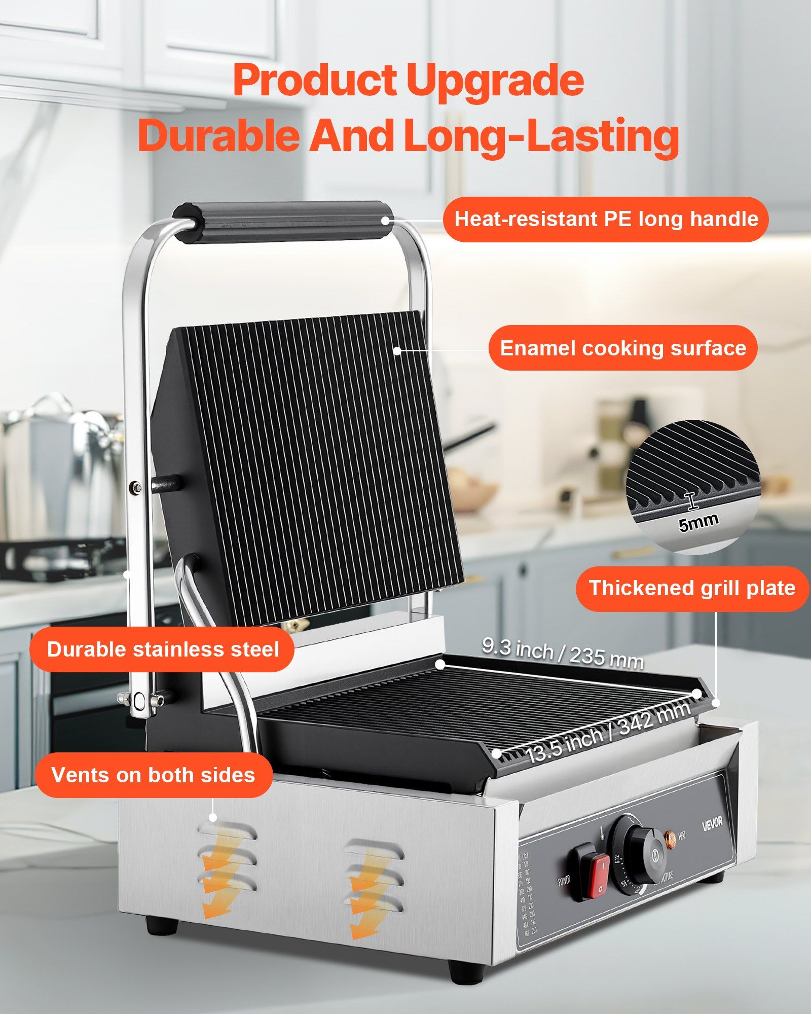 VEVOR Commercial Panini Grill, 1800W Electric Sandwich Panini Maker, Stainless Steel Sandwichs Press with Handle and Temp Control VEVOR Commercial Panini Grill, 1800W Electric Sandwich Panini Maker, Stainless Steel Sandwichs Press with Handle and Temp Control VEVOR Commercial Panini Grill, 1800W Electric Sandwich Panini Maker, Stainless Steel Sandwichs Press with Handle and Temp Control
